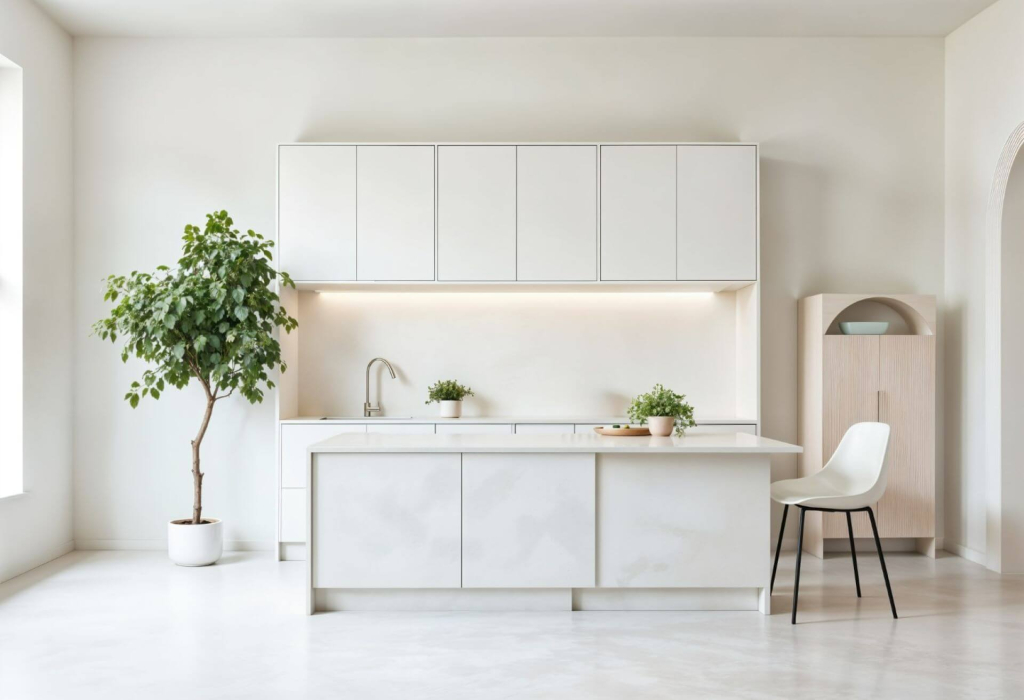 The kitchen is one of the most active spaces in the home, which makes color choices here especially important. Using Cloud Dancer on upper cabinets or backsplash zones reinforces a sense of order and clean design without making the space feel clinical.